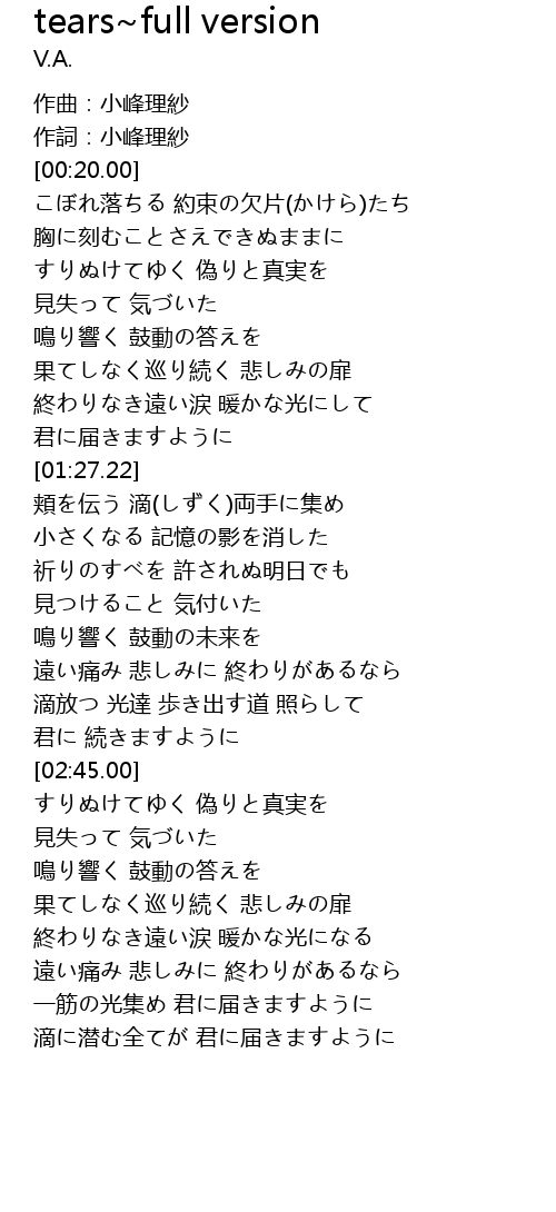 | [03:39.44] | 終わりなき遠い涙 暖かな光になる |