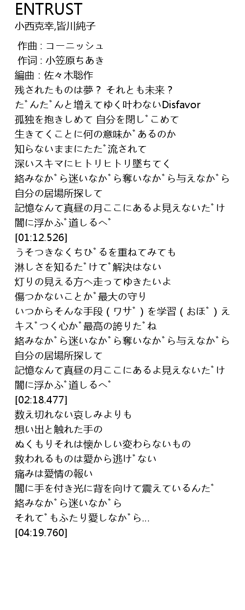 | [01:58.382] | 絡みながら迷いながら奪いながら与えながら 自分の居場所探して |