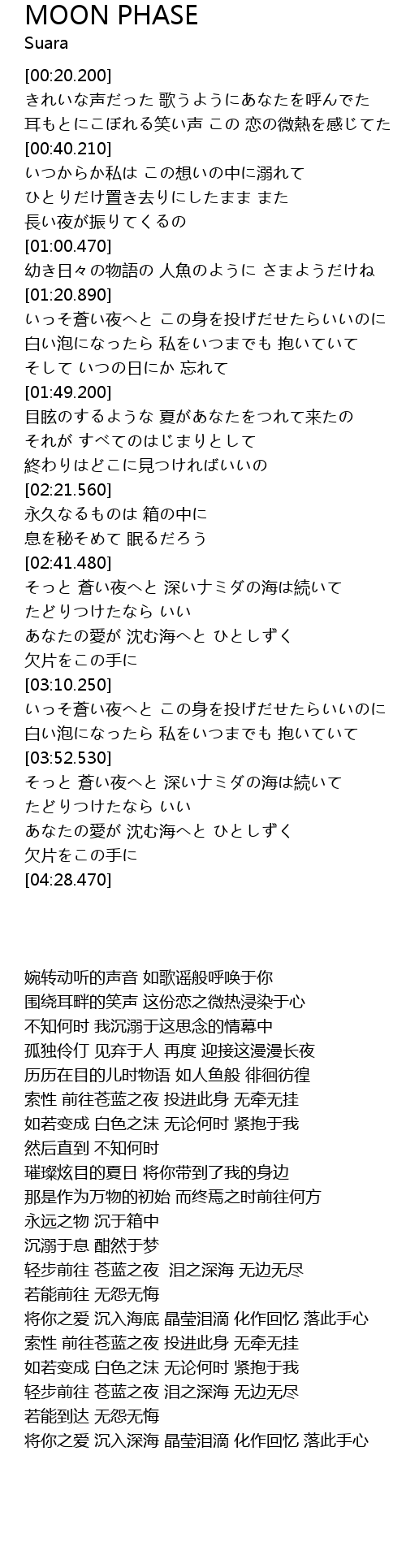 | [01:31.350] | 白い泡になったら 私をいつまでも 抱いていて |