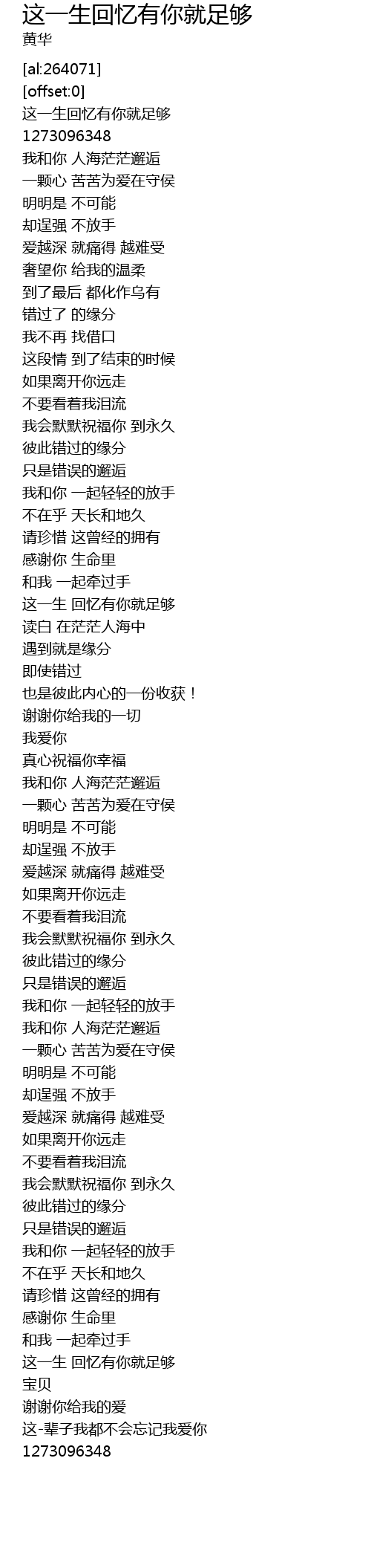 | [01:47.390] | 这一生 回忆有你就足够 |