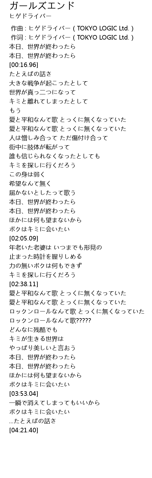 | [00:00.362] | 作词 : ヒゲドライバー(TOKYO LOGIC Ltd.) |