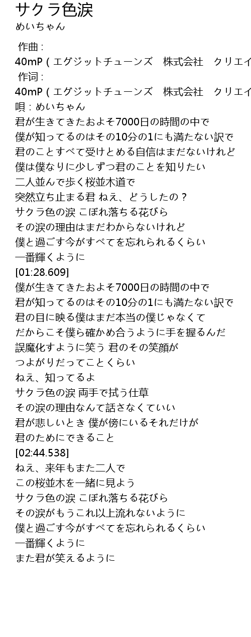 | [02:16.256] | サクラ色の涙 両手で拭う仕草 |
