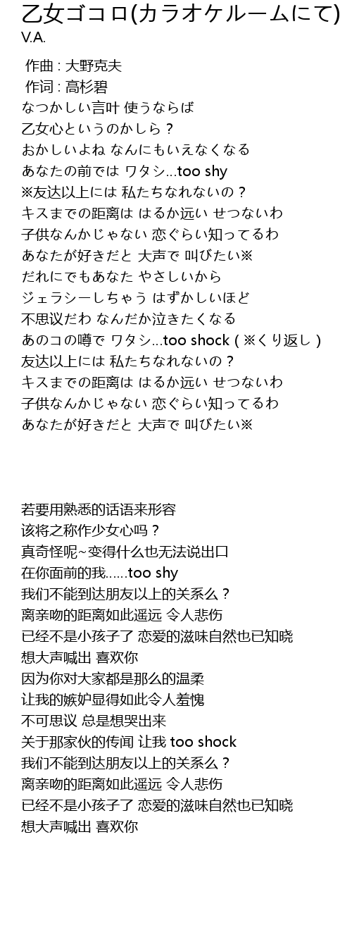 | [01:58.700] | あのコの噂で ワタシ…too shock(※くり返し) |