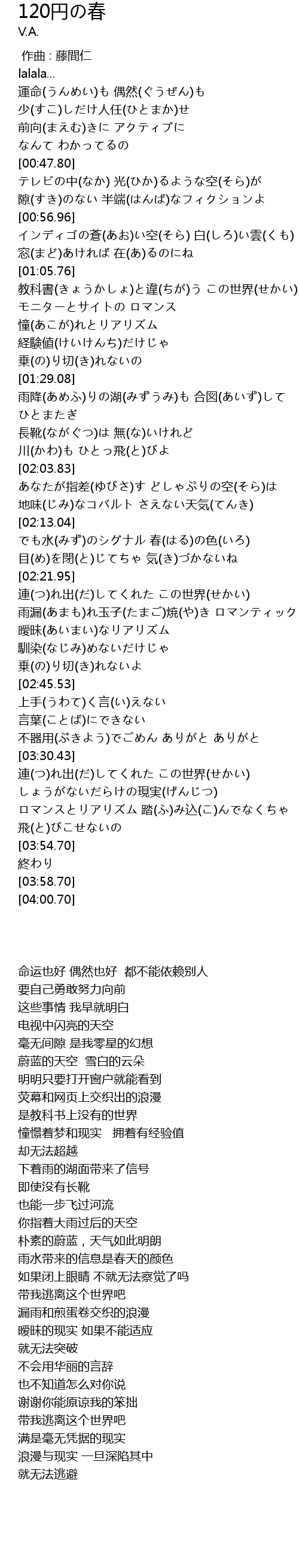| [02:13.94] | でも水(みず)のシグナル 春(はる)の色(いろ) |