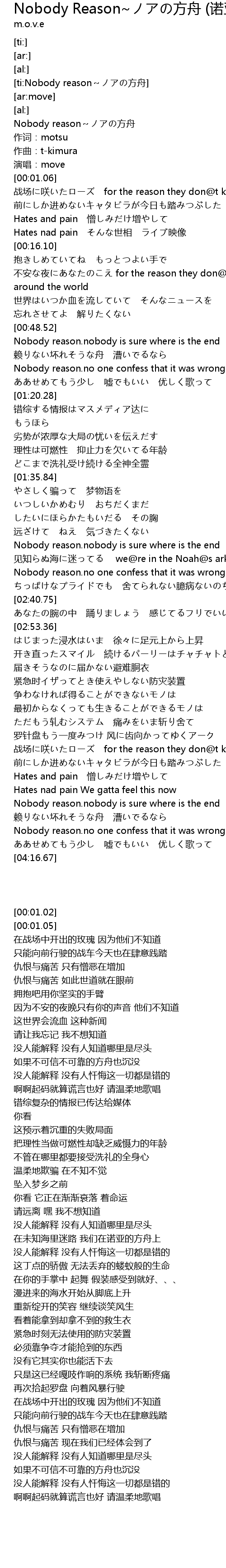 | [00:01.02] | Nobody reason~ノアの方舟 |