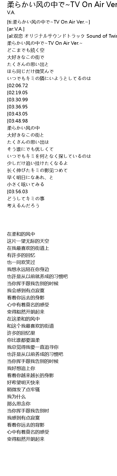 | [00:00.00] | 柔らかい风の中で~TV On Air Ver.~ |