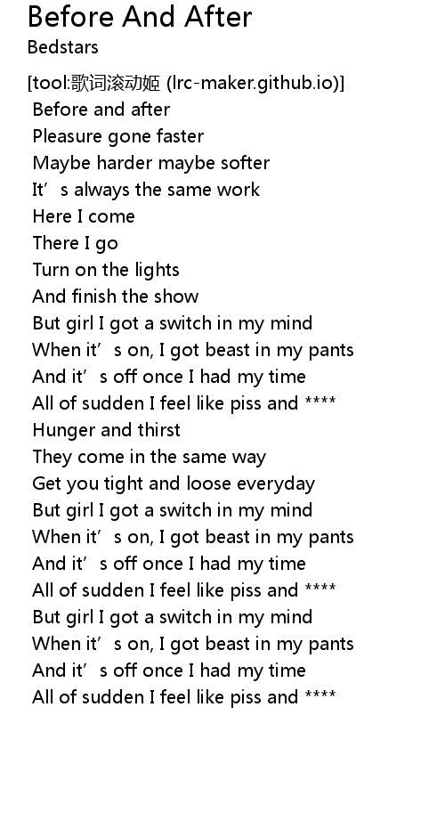 | [00:56.783] | All of sudden I feel like piss and **** |