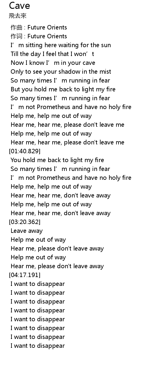 | [03:13.347] | Hear me, hear me, don' t leave away |