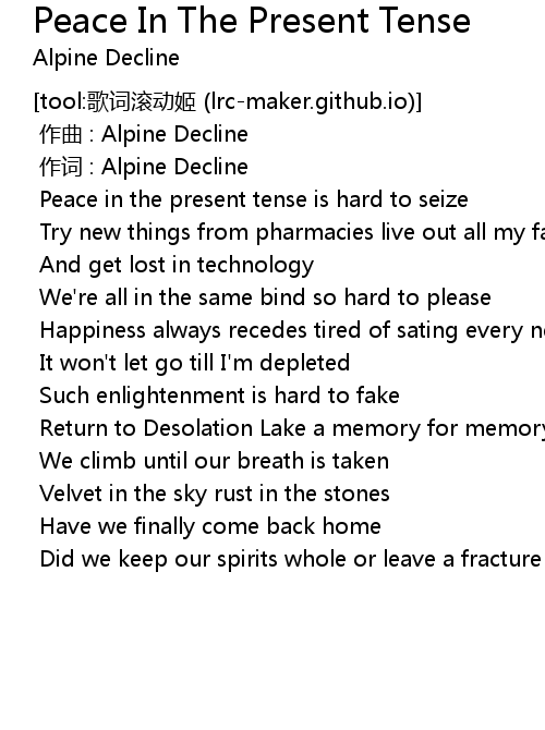 | [00:55.815] | Peace in the present tense is hard to seize |