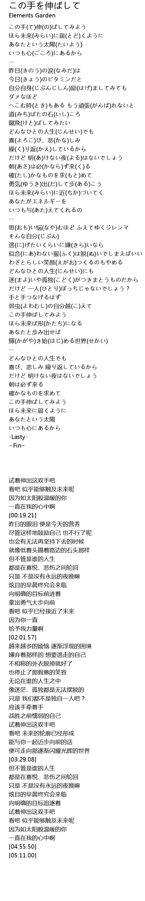 | [00:00.21] | この手(て)伸(の)ばしてみよう |
