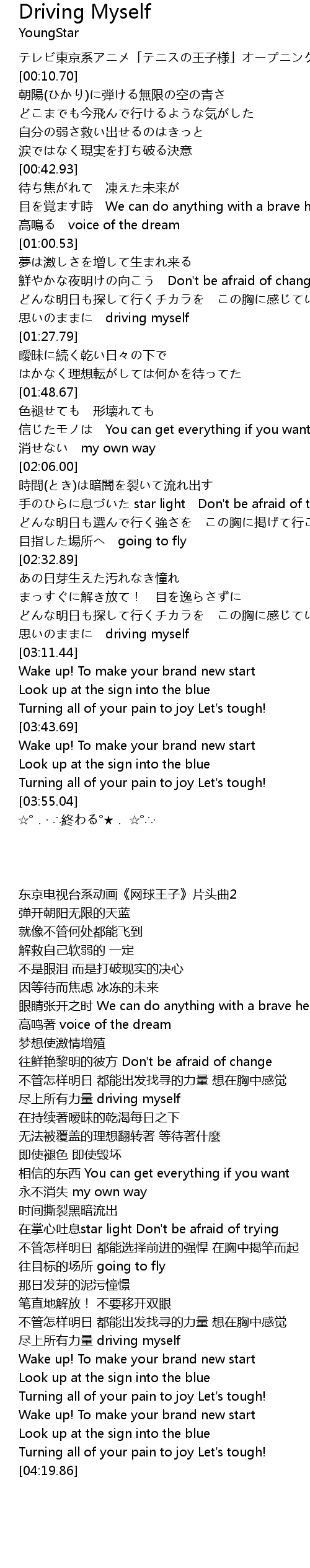 | [00:00.17] | テレビ東京系アニメ「テニスの王子様」オープニングテーマ2 |