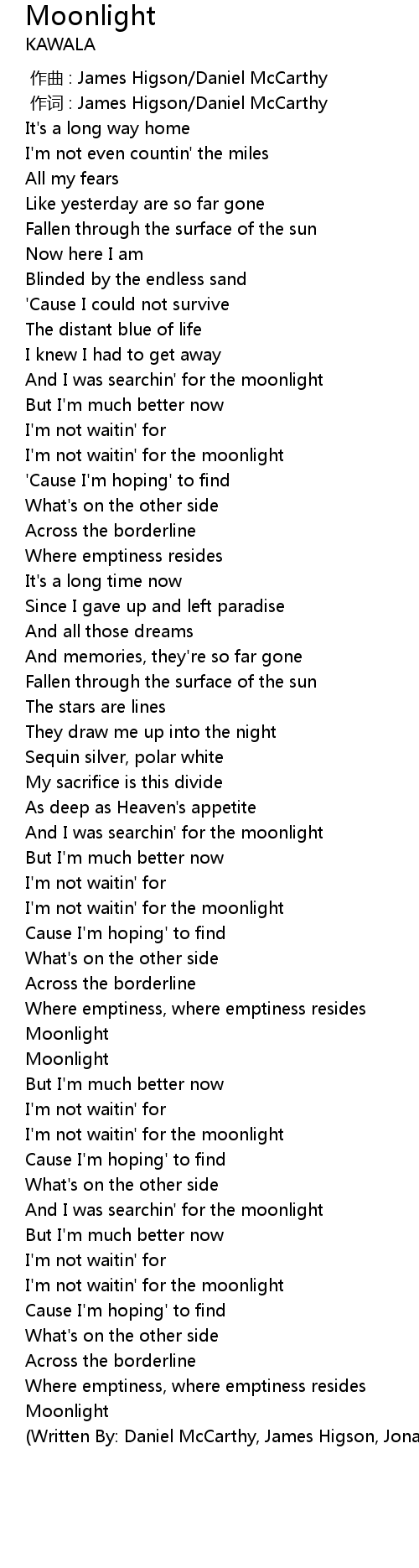 | [02:18.000] | I'm not waitin' for the moonlight |