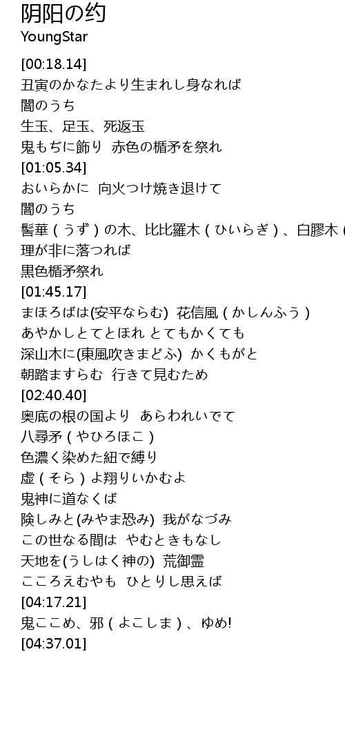| [04:20.18] | 鬼ここめ、邪(よこしま)、ゆめ! |