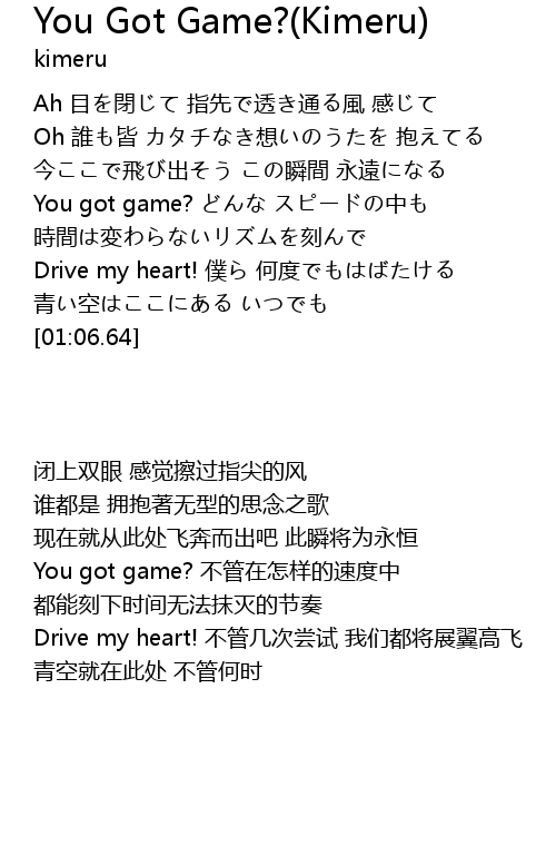 | [00:54.62] | Drive my heart! 僕ら 何度でもはばたける |