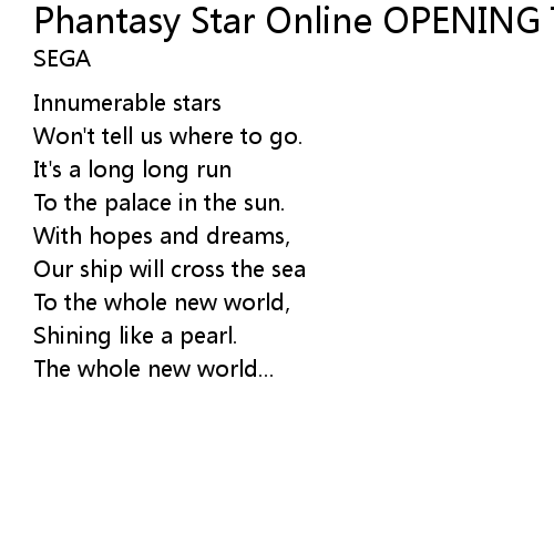 | Song | Phantasy Star Online OPENING THEME ~The whold new world~ (Lyric Version) |