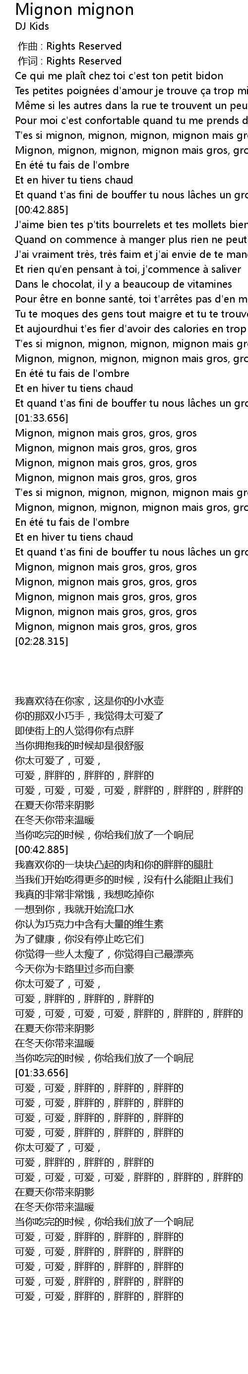 | [00:30.705] | Mignon, mignon, mignon, mignon mais gros, gros, gros |