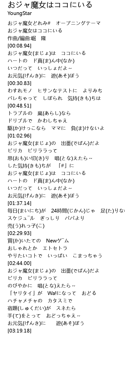 | [00:17.14] | おジャ魔女(まじょ)は ココにいる |