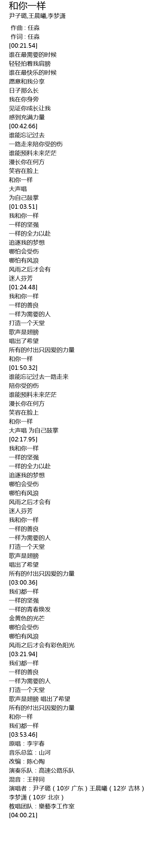 | [03:57.98] | 演唱者:尹子璐(10岁 广东)王晨曦(12岁 吉林) |