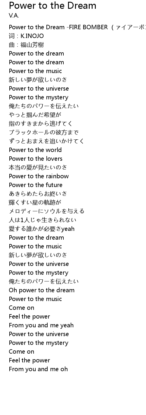 | [00:00.00] | Power to the Dream -FIRE BOMBER (ァイアーボンバー) |