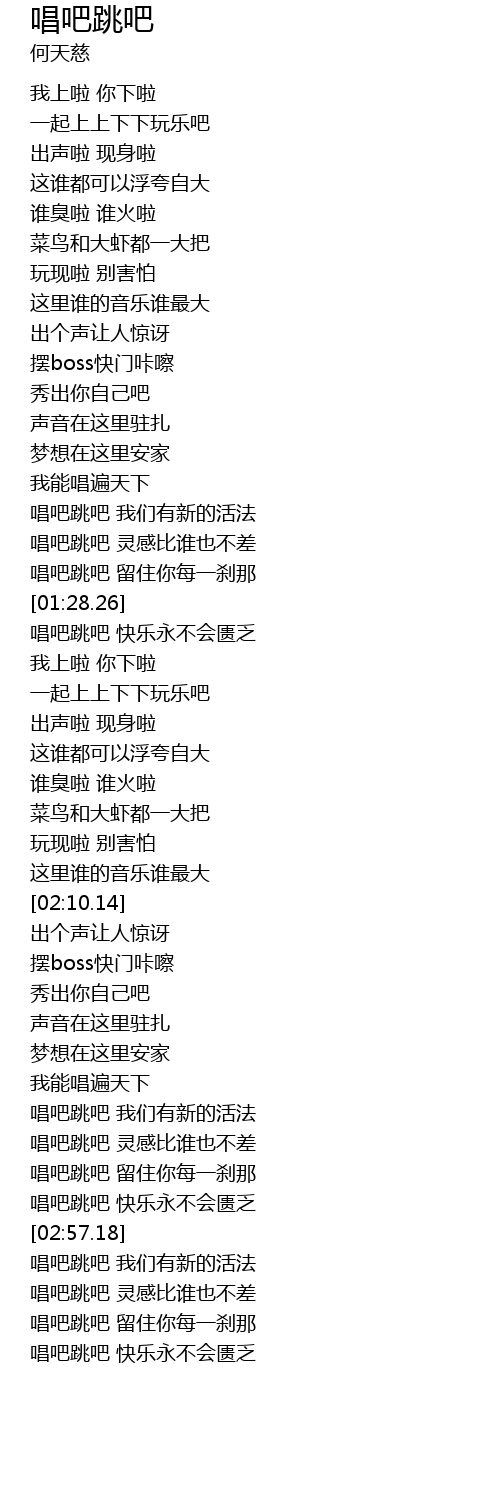 | [01:29.09] | chàng ba tiào ba kuài lè yǒng bú huì kuì fá |