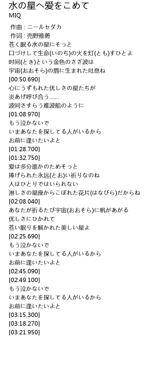 | [00:22.800] | 苍く眠る水の星にそっと |