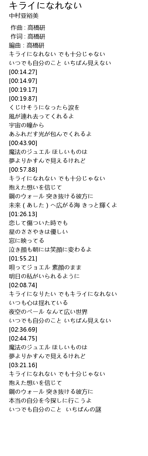 | [02:09.74] | キライになりたい でもキライになれない |