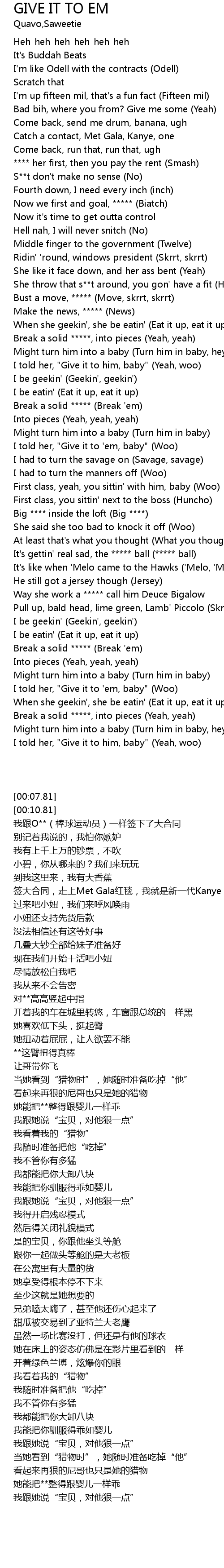 | [01:06.49] | She throw that s**t around, you gon' have a fit (Hey, yes sir) |