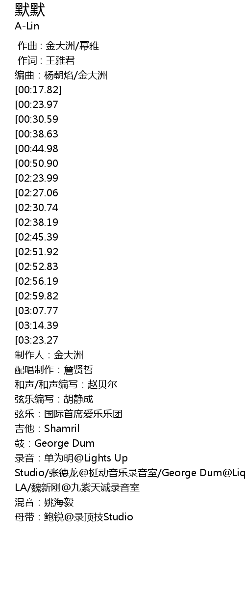 | [04:36.34] | lu yin: dan wei ming Lights Up Studio zhang de long ting dong yin yue lu yin shi George Dum Liquid Fish Studio LA wei xin gang jiu zi tian cheng lu yin shi |