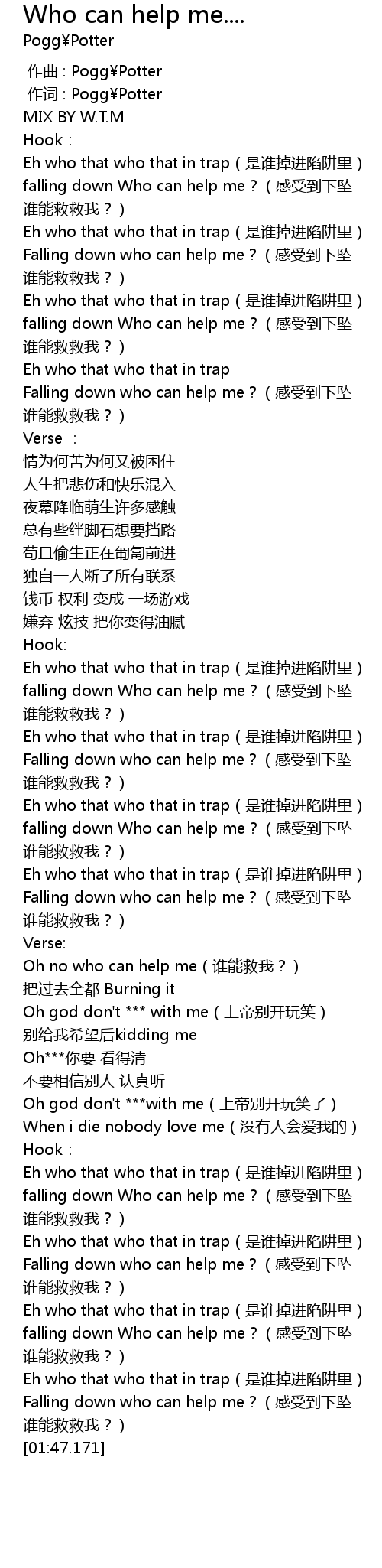 | [01:44.346] | Falling down who can help me?(感受到下坠 谁能救救我?) |