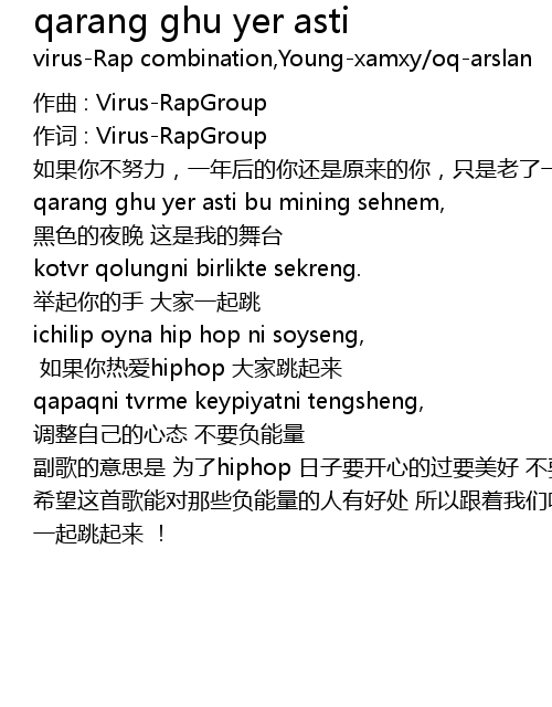 | 副歌的意思是 为了hiphop 日子要开心的过要美好 不要负能量 希望这首歌能对那些负能量的人有好处 所以跟着我们唱起来 一起跳起来 ! |