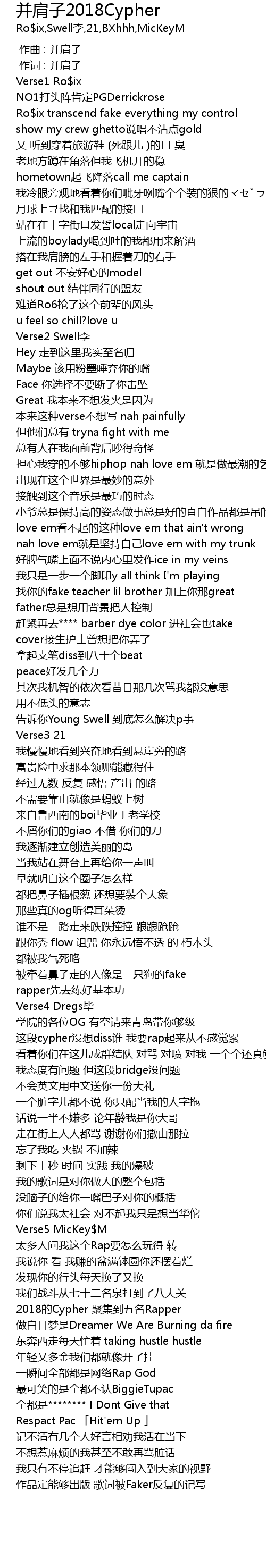 | [02:27.093] | 这段cypher没想diss谁 我要rap起来从不感觉累 看着你们在这儿成群结队 对骂 对喷 对我 一个个还真够废 |