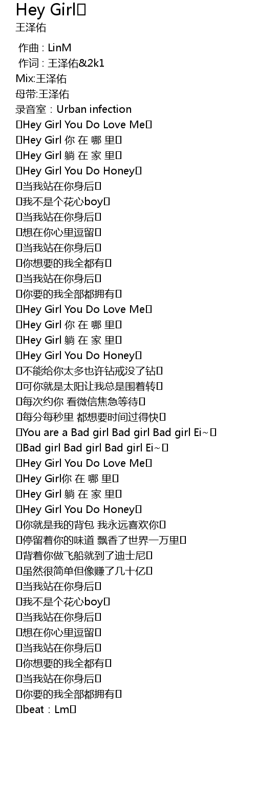 | [01:32.83] | Hey Girl nǐ zài nǎ lǐ |