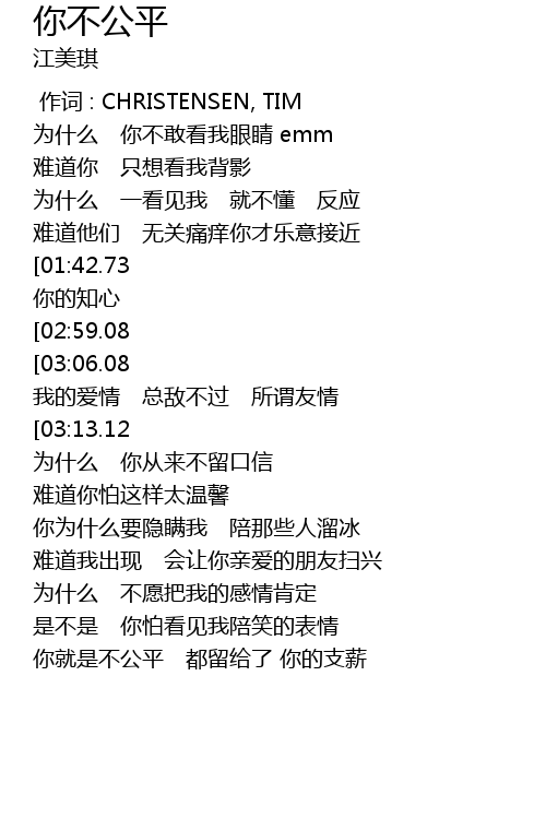 | [03:22.22][01:42.73][00:38.64] | 好不公平 你的高兴 都留给了 你的知心 |