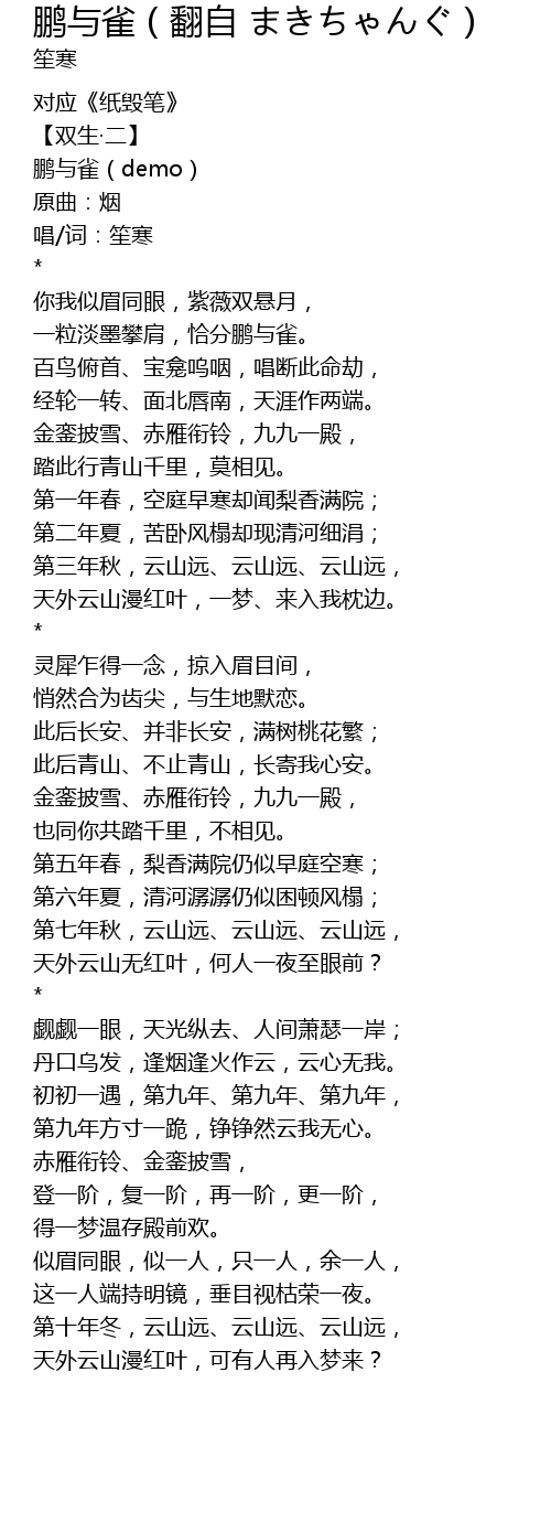 | [00:32.75] | 一粒淡墨攀肩,恰分鹏与雀。 |