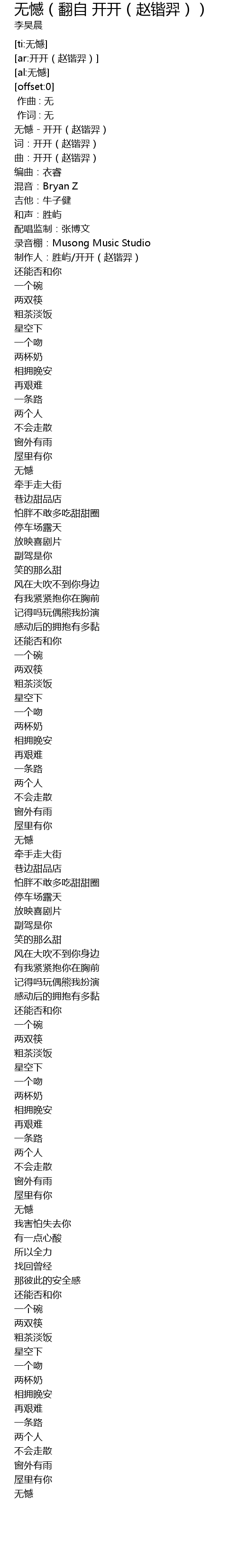 | [00:00.30] | 无憾 - 开开(赵锴羿) |