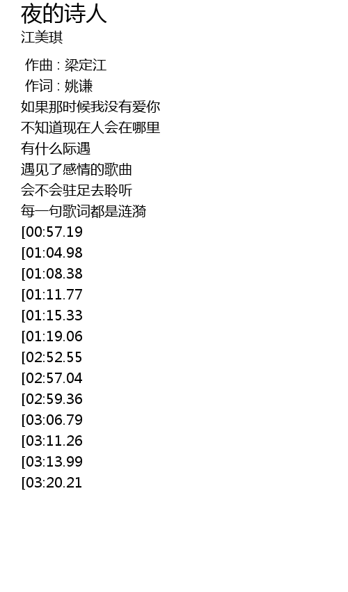 | [03:32.82][02:57.04][01:30.51] | 夜里的诗人 |