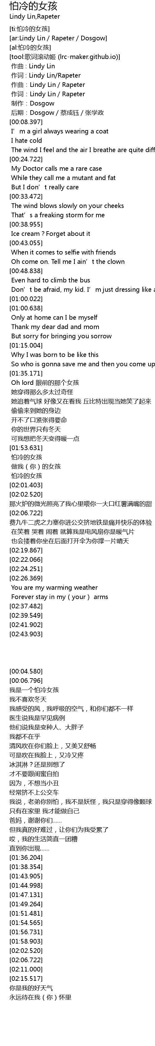 | [00:00.000] | 作词 : Lindy Lin/Rapeter |