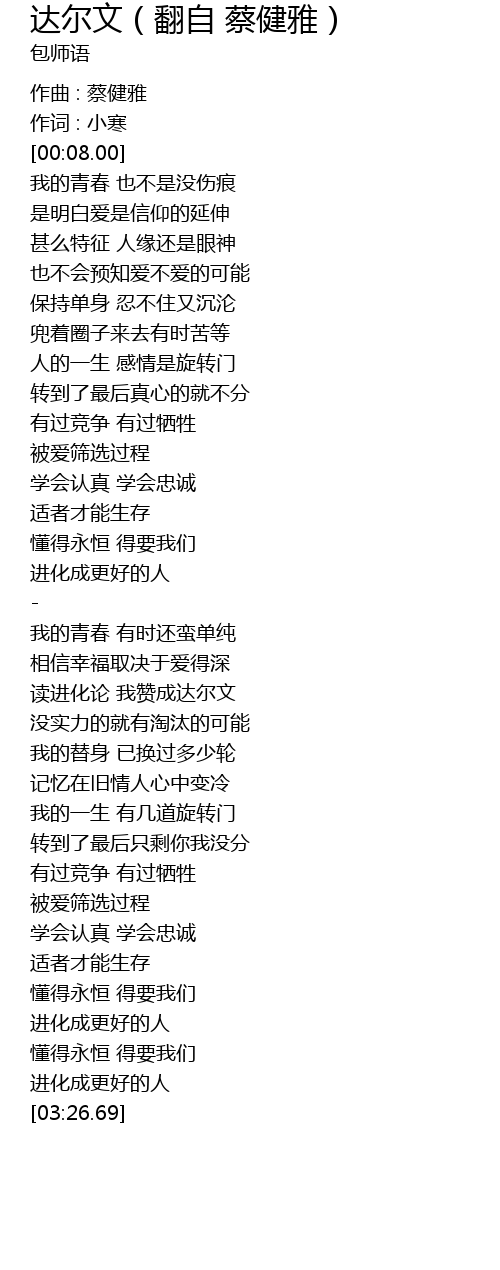 | [02:03.36] | 读进化论 我赞成达尔文 |