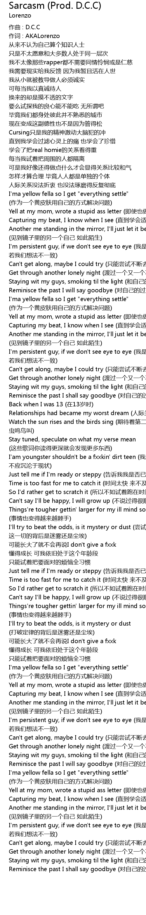 | Stay tuned, speculate on what my verse mean zhèi xiē gē cí nǐ dú dé gēng shēn jiù huì fā xiàn gèng duō dōng xī | |
