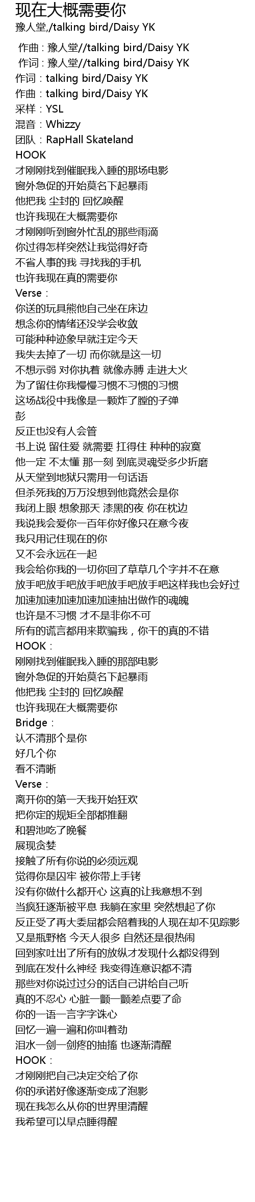 | [00:00.356] | 作词 : 豫人堂//talking bird/Daisy YK |
