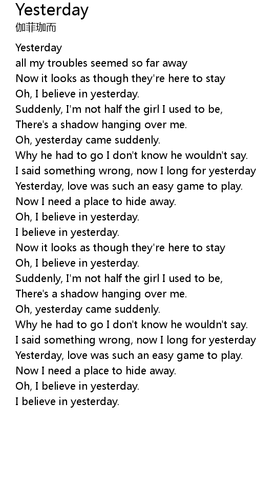 | [00:35.830] | Oh, yesterday came suddenly. |
