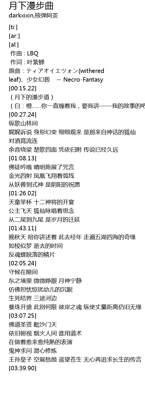 | [00:05.62] | 原曲:ティアオイエツォン(withered leaf)、少女幻葬 ~ Necro-Fantasy |