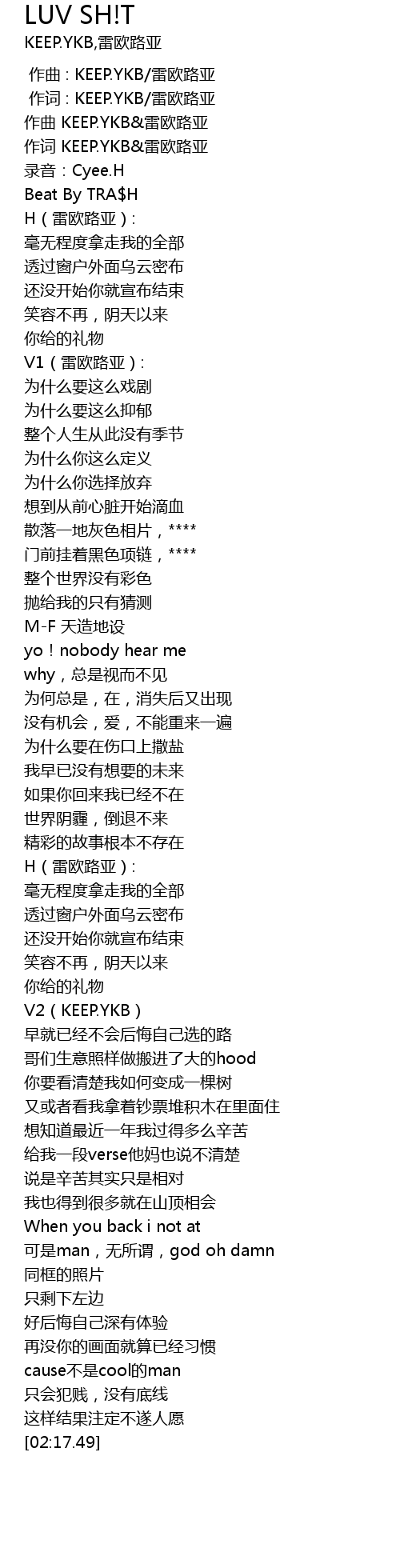 | [01:47.60] | 给我一段verse他妈也说不清楚 |