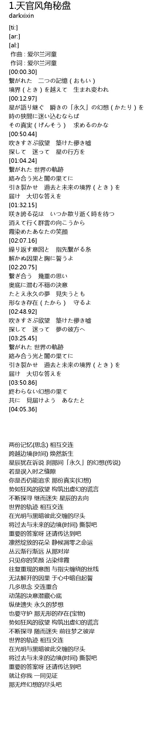 | [00:25.69] | 星が語り継ぐ 瞬きの「永久」の幻想(かたり)を |