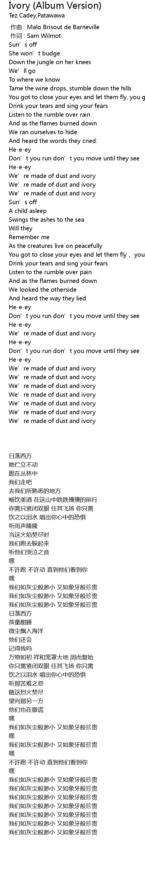 | [02:47.28] | We' re made of dust and ivory |