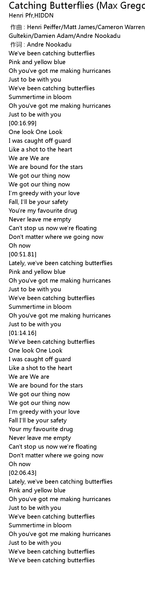 | [00:52.82] | Lately, we' ve been catching butterflies |
