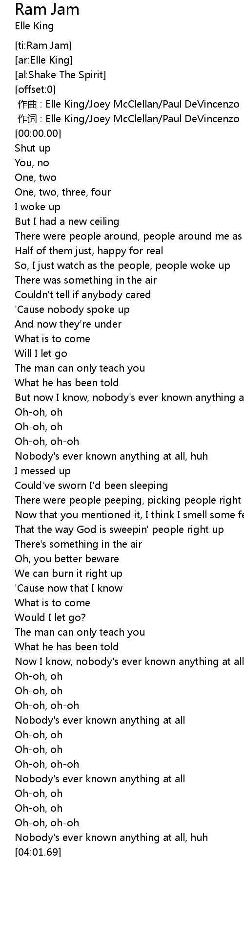 | [00:00.000] | 作词 : Elle King/Joey McClellan/Paul DeVincenzo |