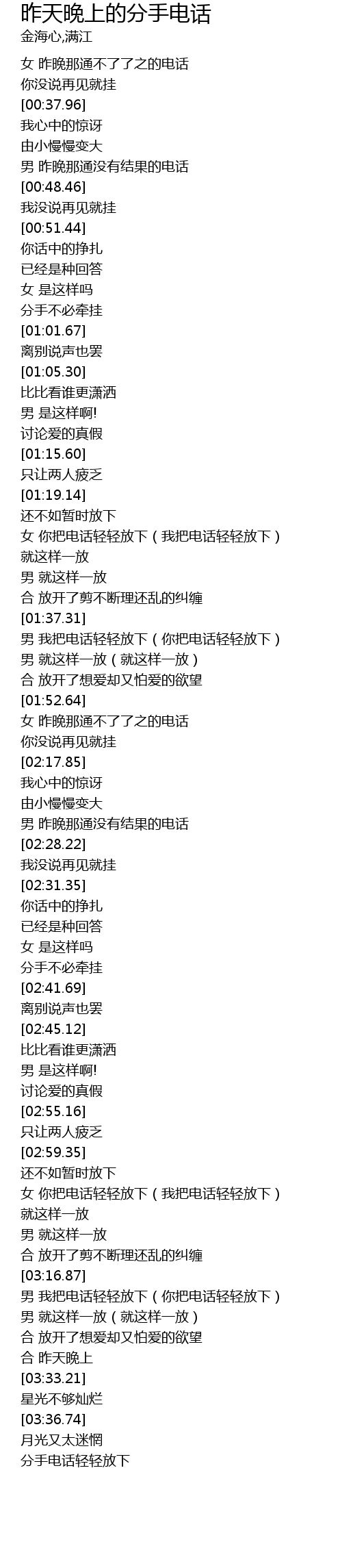 | [03:18.36] | 男 我把电话轻轻放下(你把电话轻轻放下) |