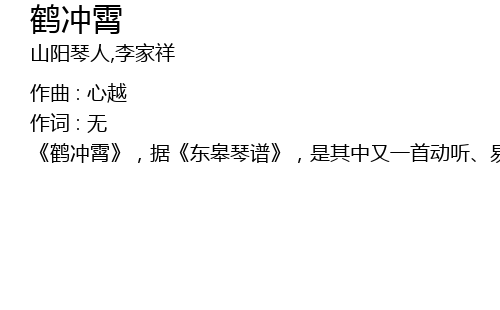 | 《鹤冲霄》,据《东皋琴谱》,是其中又一首动听、易学的古琴曲(另一首《长相思》)。明末清初心越禅师(别号东皋)东渡日本,弘法传道,心越禅师擅长书画、篆印,喜爱诗词、古琴,更精研佛理、禅学,是难得的集文化艺术素养于一身的得道高僧。心越禅师的弟子们,根据禅师的传授和禅师所遗留的资料编辑成《东皋琴谱》。 |