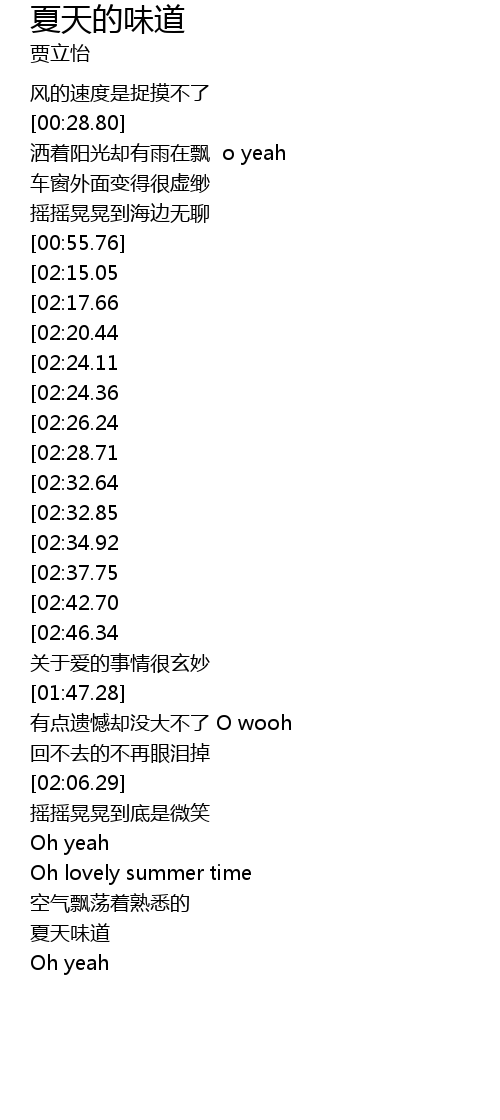 | [03:30.61][02:37.75][01:19.02] | xià tiān de hǎi hěn liáo kuò tiān hěn lán yě hěn gāo |